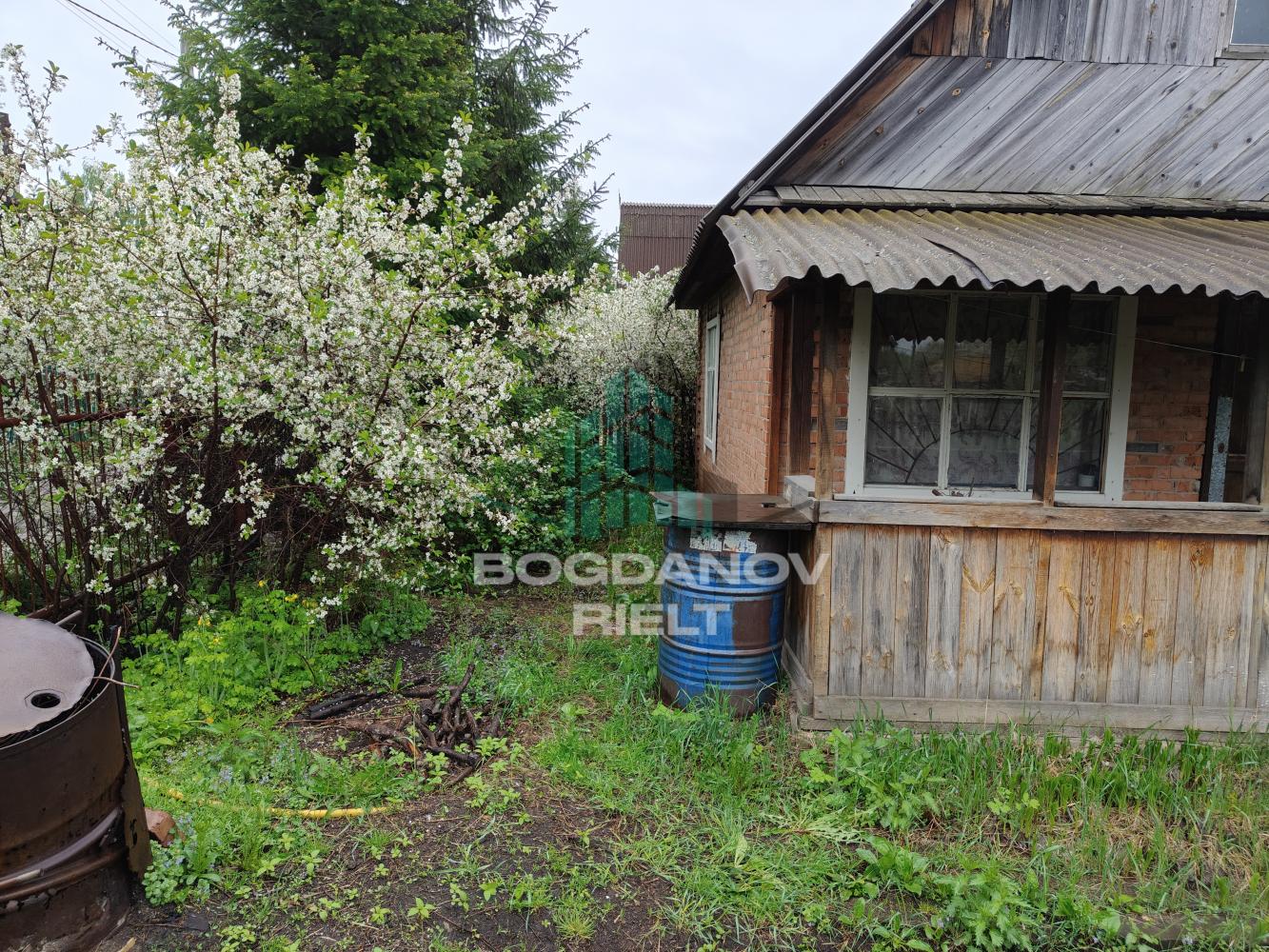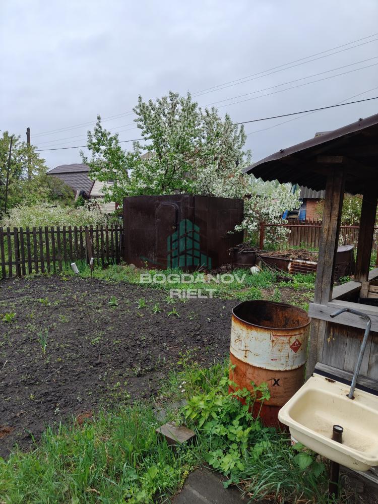 • Участок **полностью огорожен**: спереди — металлический прут, по периметру — деревянный штакетник.