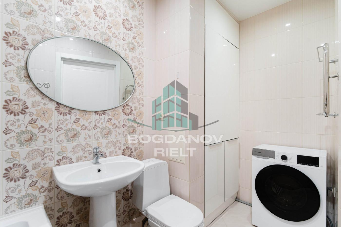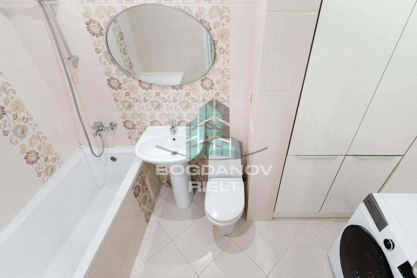 В санузле новая сантехника. Установлена стиральная машинка и вместительный встроенный шкаф.