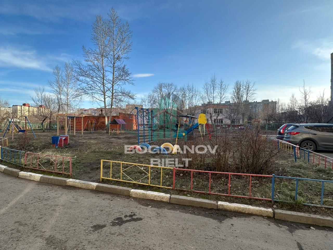 Во дворе дома современная детская площадка.